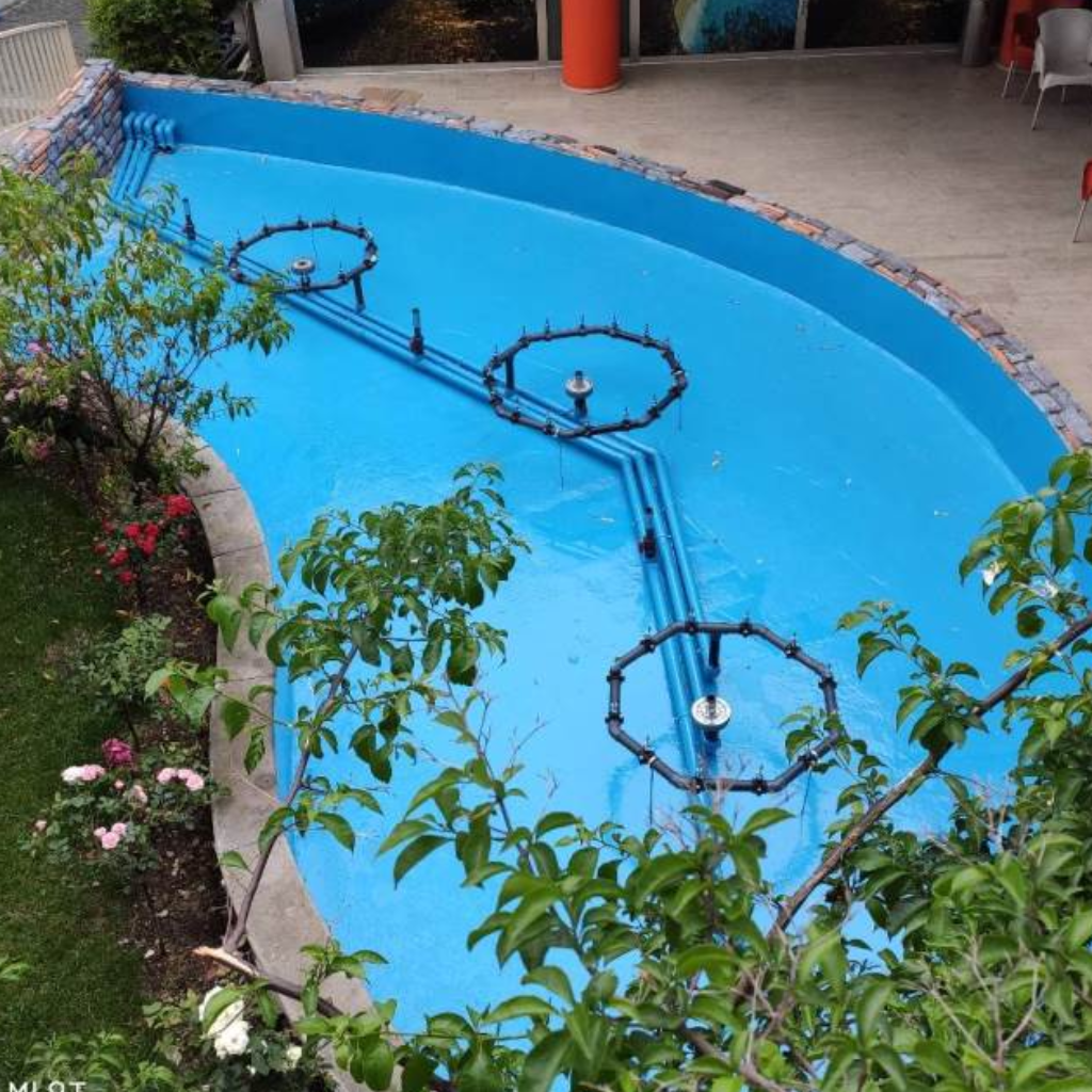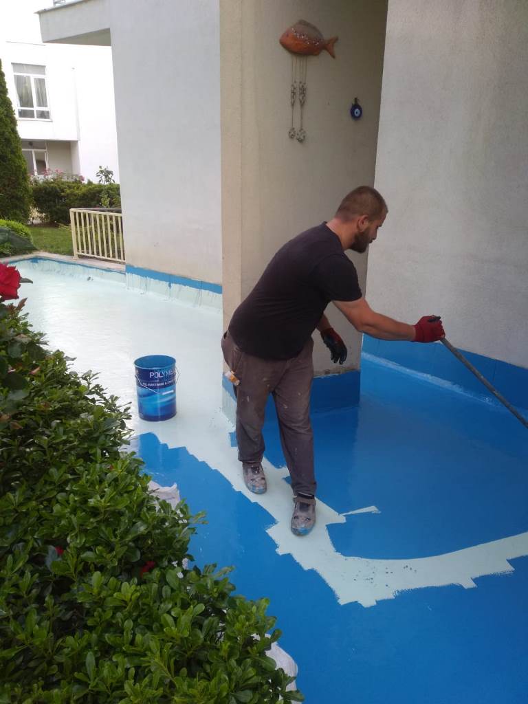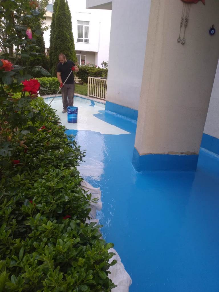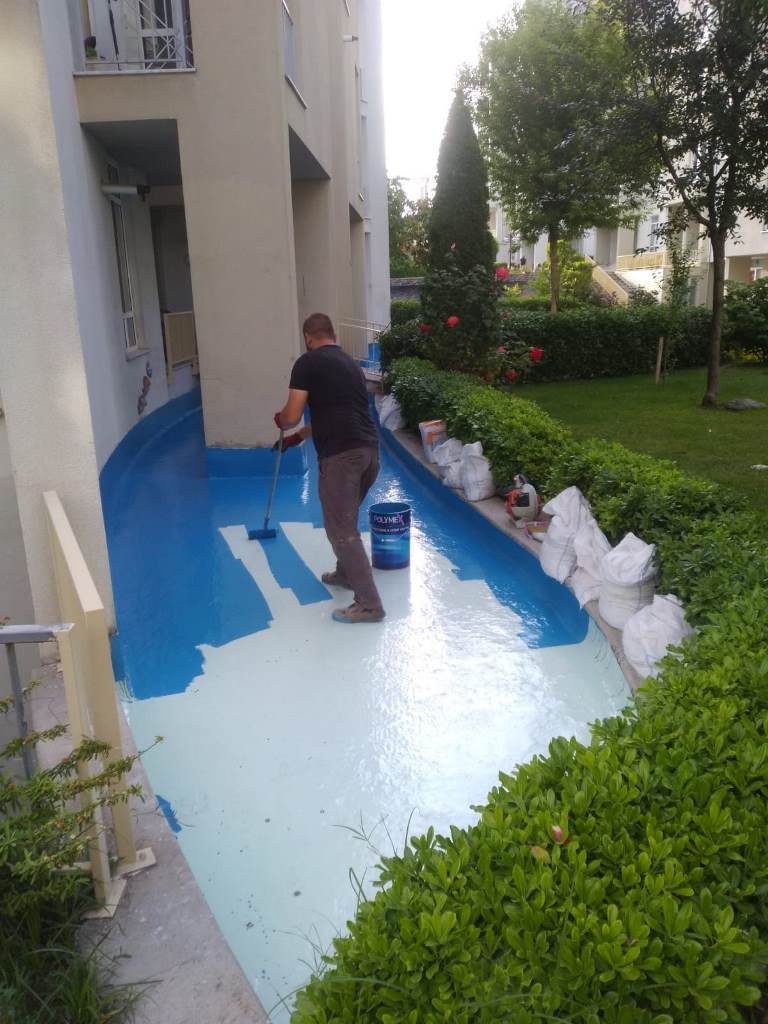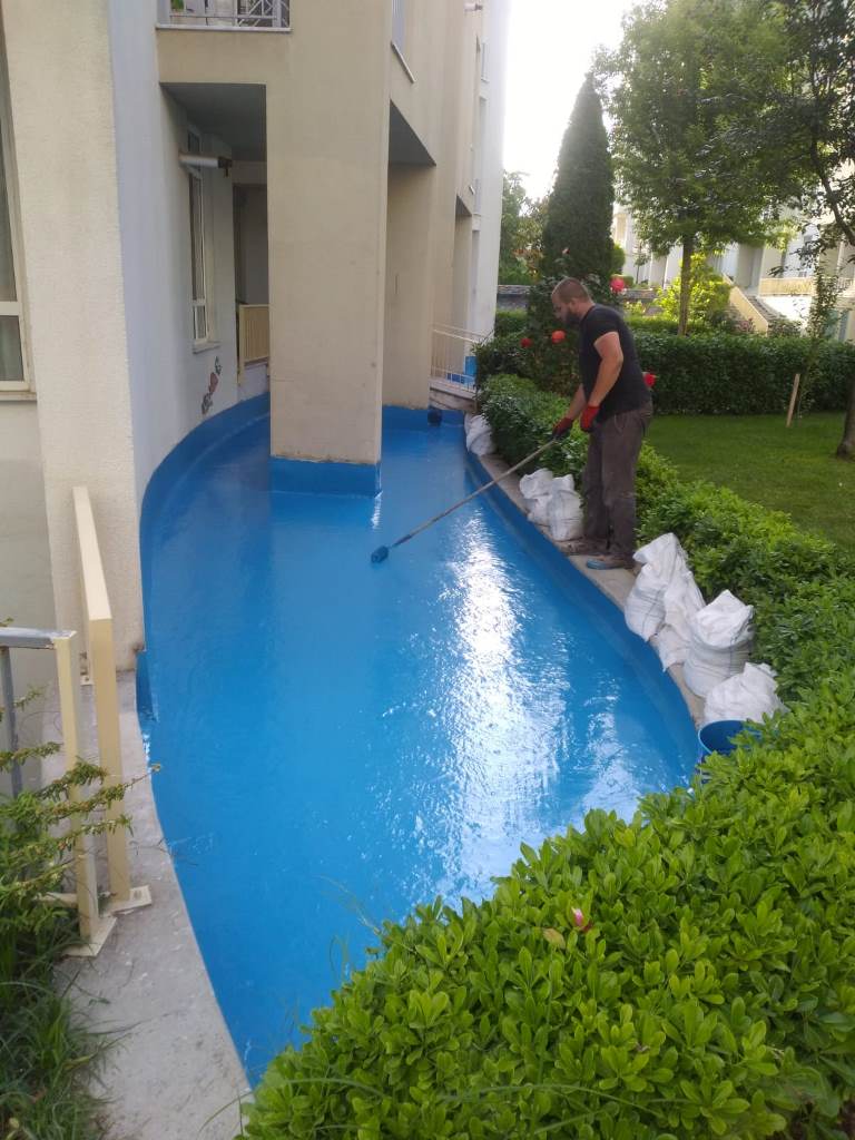 350 m² alana sahip olan süs havuzunda; mevcut zeminde bulunan çakıl taşlar alınarak zemin betonuna poliüretan esaslı dış mekan yalıtım uygulaması yapılmıştır.